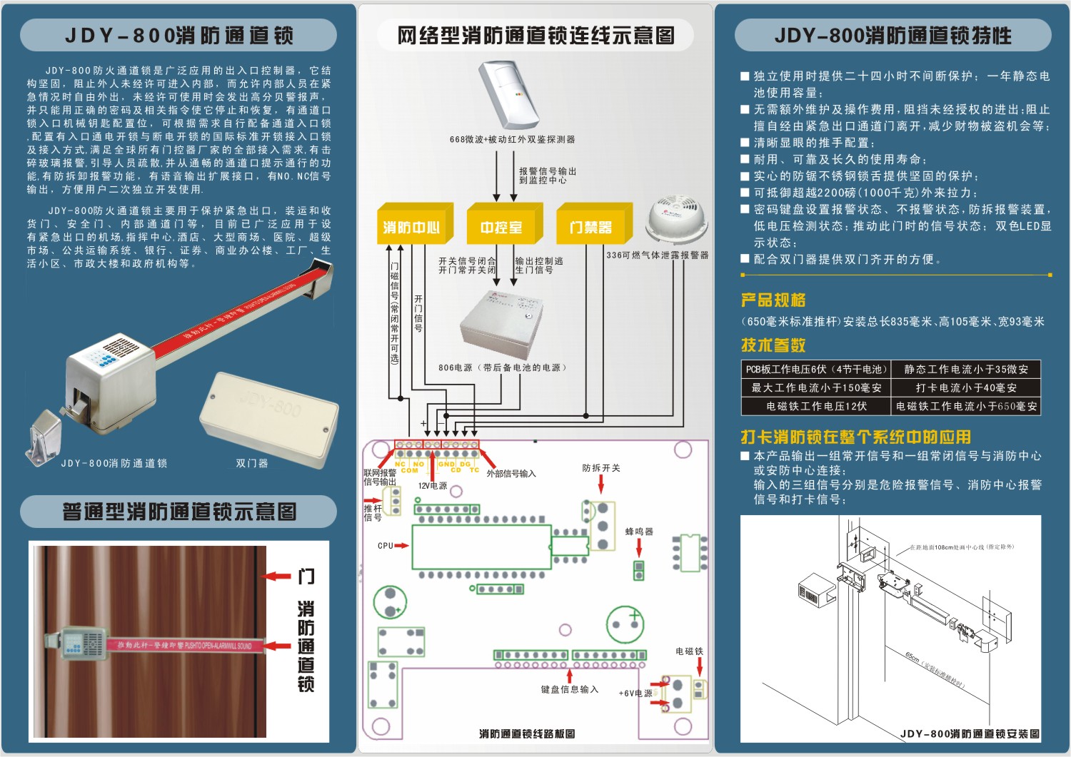 JDY-800消防通道锁是广泛应用的出入口控制器,它结构坚固,阻止外人未经许可进入内部,而允许内部人员在紧急情况时自由外出,未经许可使用时会发出高分贝警报声,并只能用正确的密码及相关指令使它停止和恢复,有通道口锁入口机械钥匙配置位,可根据需求自行配备通道入口锁,配置有入口通电开锁与断电开锁的国际标准开锁接入口锁及接入方式,满足全球所有门控器厂家的全部接入需求,有击碎玻璃报警,引导人员疏散,并从通畅的通道口提示通行的功能,有防拆卸报警功能,有语音输出扩展接口,有NO。NC信号输出,方便用户二次独立开发使用。    JDY-800消防通道锁主要用于保护紧急出口,装运和收货门、安全门、内部通道门等,目前已广泛应用于设有紧急出口的机场,指挥中心,酒店、大型商场、医院、超级市场、公共运输系统、银行、证券、商业办公楼、工厂、生活小区、市政大楼和政府机构等。