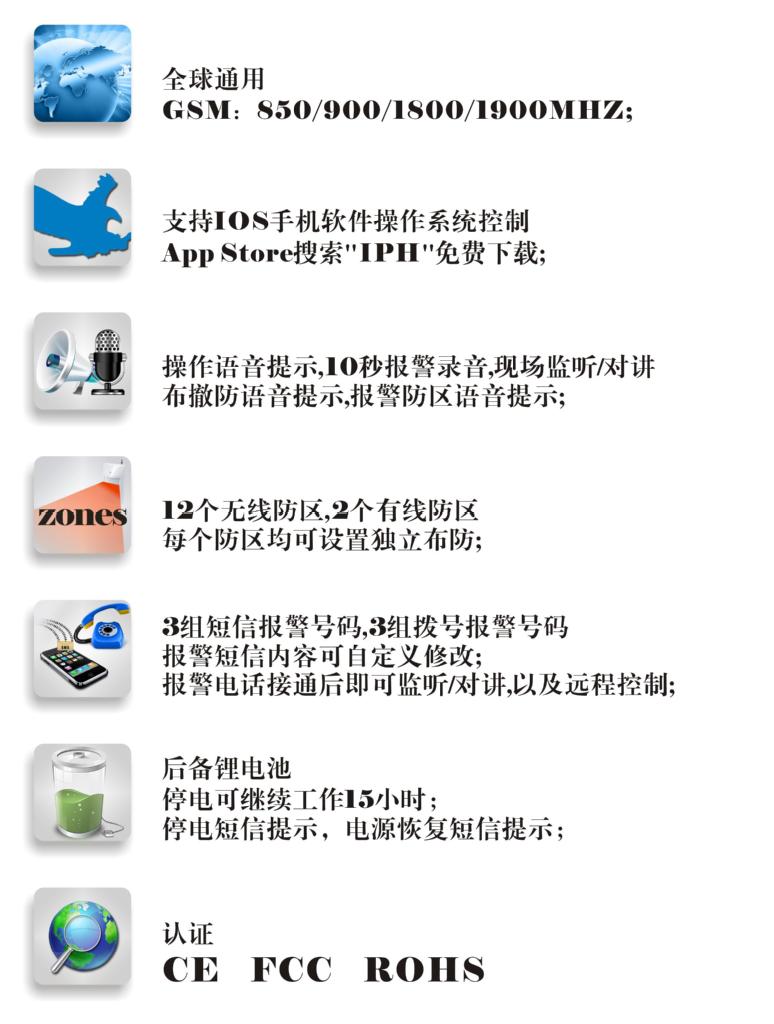 ◆报警方式:GSM中文短信、语音拨号及现场鸣警笛