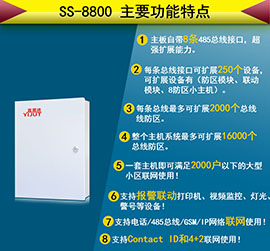 SS-8800八条总线接警中心机为宜居通110联网报警接警中心设备之一,该接警中心机别名又叫小区联网报警主机系统,系统采用485总线通讯设计架构,主机系统具有双核处理器,运行速度更快,性能更稳定,安全系数更高,主机主板自带8个485总线通讯接口,每个总线通讯接口最远通讯距离可达1.2km,每条总线可以485总线扩展250个总线设备,整个8条总线接警中心机最大可以485扩展2000个总线防区设备,最多支持16000个总线防区,一台8条总线接警主机就可以满足一个2000户的中大型小区的总线联网报警应用,且可以通过固定电话网络将报警信号上传到物业管理中心或者公安局进行110联网使用,系统支持安定宝联网协议(Contact ID和4+2)。该总线接警主机已经广泛应用于江苏、浙江等大型小区联网报警项目。