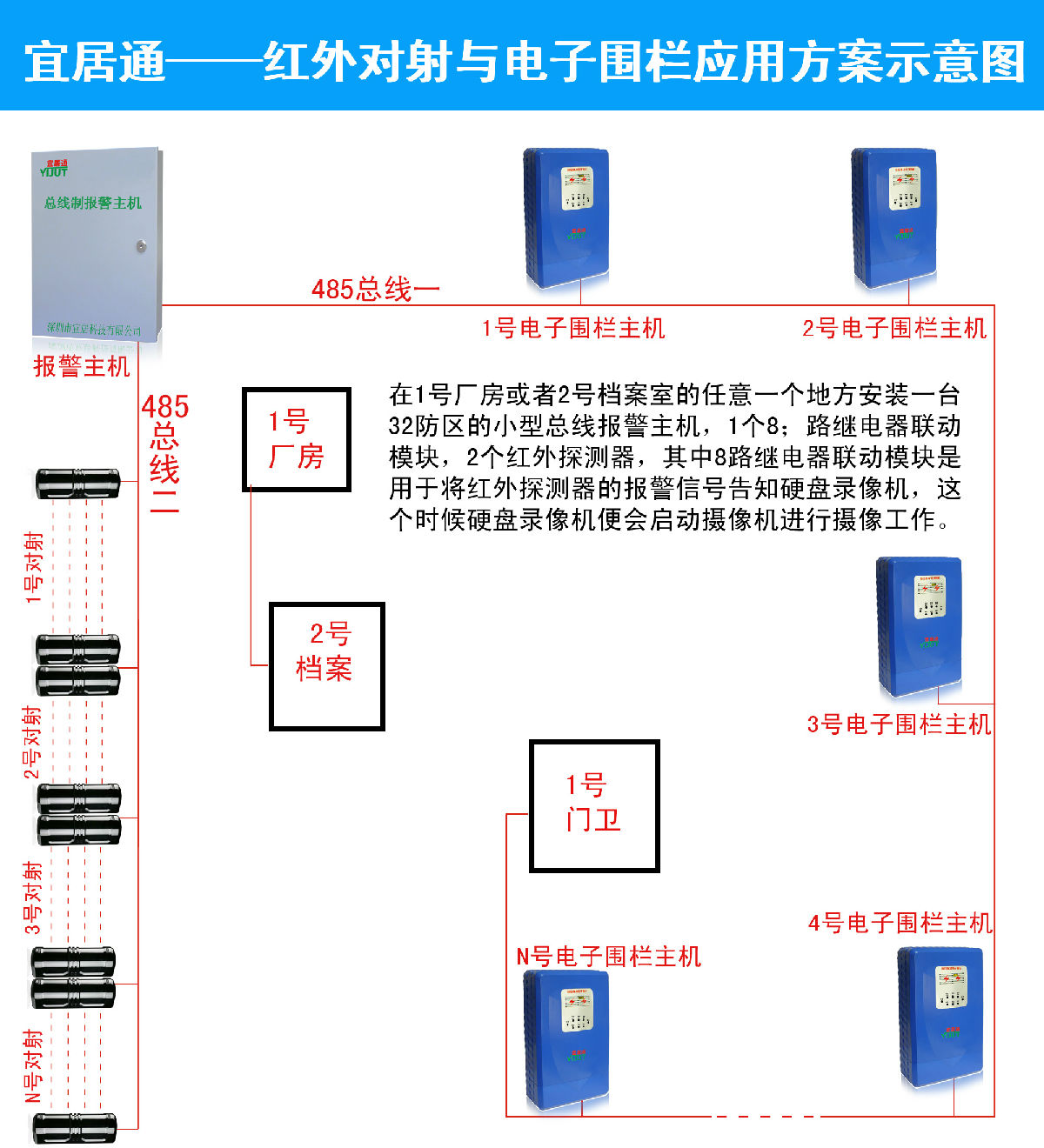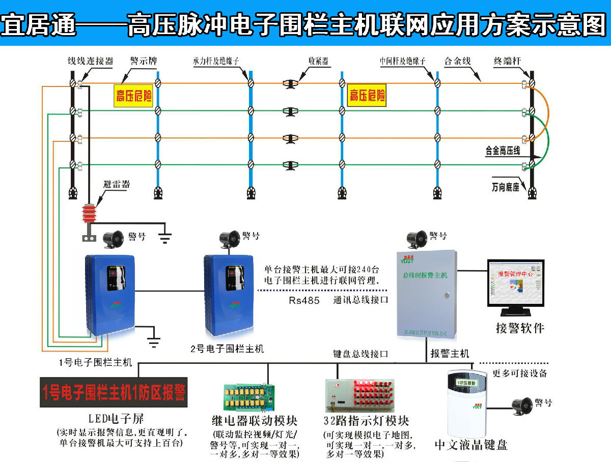 深圳市宜居科技有限公司专业研发、生产脉冲电子围栏主机、周界电子电子围栏主机、高低压切换电子围栏主机等安防产品,广泛应用于小区围墙周界、别墅周界安全防范、监狱高压警戒报警、博物馆防盗报警等安防领域,不仅生产电子围栏主机等产品,更可免费提供电子围栏主机应用方案设计,已经电子围栏主机安装调试和售后维修跟踪服务!让您从购买到安装调试已经售后维修都没有后顾之忧!电子围栏主机就选宜居通,周界安全防范的不二选择!