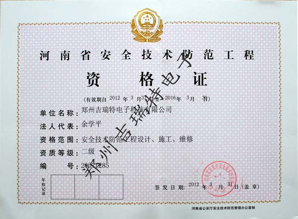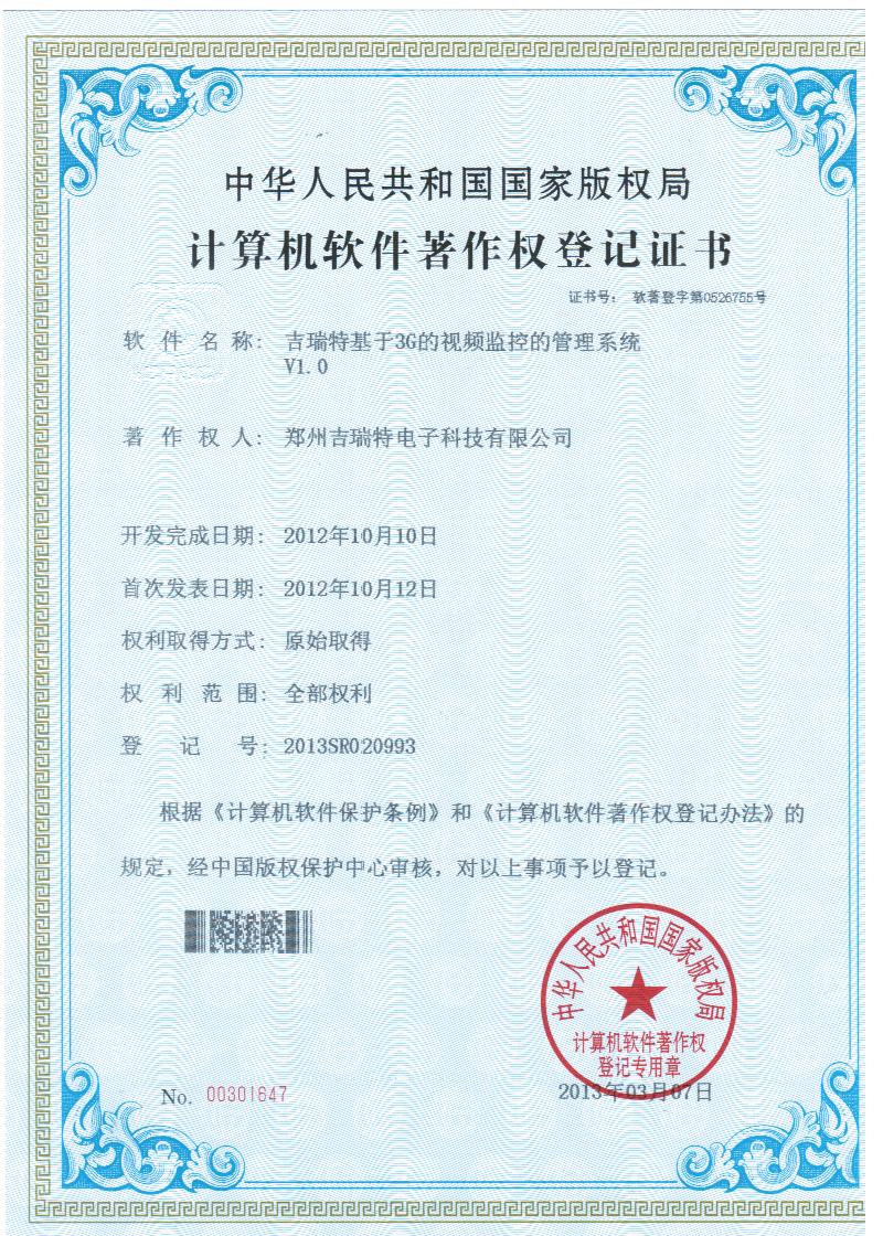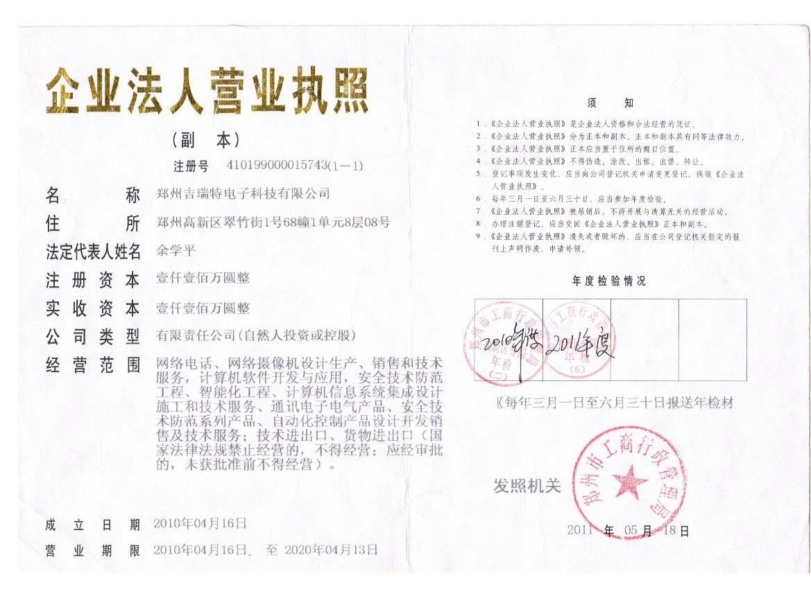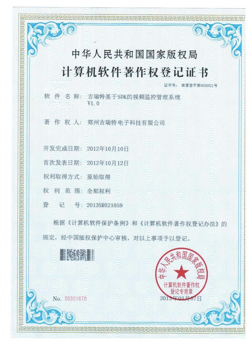郑州吉瑞特电子科技有限公司是一家集研发、生产、销售、服务于一体的生产网络摄像机系列产品和网络电话系列产品的高新技术企业。公司致力于为客户提供基于互联网、云存储和3G的实时监控(含手机监控)及应急指挥调度、智能分析、智能交通等整体信息化解决方案,同时提供安防监控、智能化弱电、系统集成、云平台远程视频运营等的设计、施工及维保等相关服务。