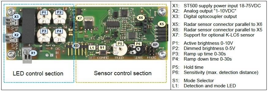 (典型接线图) 说明: ◆ 支持大多数K-LC系列模块 ◆ 速度最大可探测值到50km/h ◆ 荧光灯干扰抑制 ◆ 数字/模拟信号双输出 ◆ 可选节能脉冲模式 ◆ 包含一个K-LC1a雷达传感器 用于这个模组最远可探测距离: K-LC1a 80° x 34° 10mK-LC5 80° x 34° 20m K-LC6 80° x 12° 30m