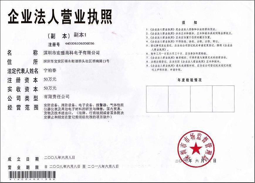 深圳市宏盛高科电子有限公司是专业研发、生产、销售消防、安防设备的高科技企业。公司自有生产工厂与研发中心,拥有自主知识产权及核心技术。近年来,公司以居家消安全、城市消防安全为核心业务,在相关领域不断延伸、拓展,努力将“宏安”品牌打造成消防、安防行业具有重大影响力的品牌。