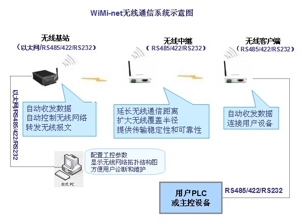 一个无线基站,支持64级无线中继,65535个无线客户端从节点。WiMi-net目前推出的无线客户端,支持RS232,RS485,RS422三种接口