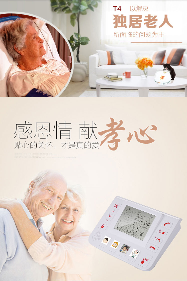 T4 老人助手插入手机卡后,既可用作父母一键测量血压短信提示,也可用于解决老人拨打电话、未起 床报警、跌倒报警、紧急求救、烟雾燃气泄漏报警、室温超限、入室报警等功能。