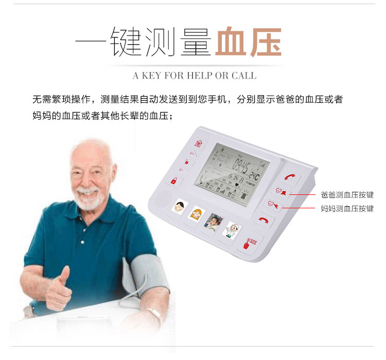 ◆2 个一键测量血压按键,测量后发送短信提示你父母的血压心率;