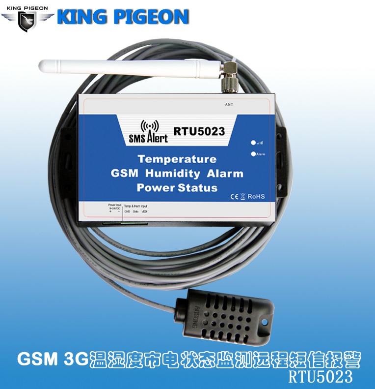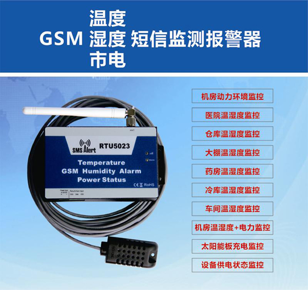 GSM 3G温湿度市电状态监测远程短信报警器RTU5023采用工业级设计,专为工业远程监测环境温度、湿度、市电状态以及直流电压的短信报警器,采用稳定可靠的高性能微处理器MCU, 内置工业级GSM/GPRS/3G通信模块,适用于中国移动、中国联通的GSM网络、中国联通的WCDMA 3G网络,是一款具有性价比的远程环境监测报警器。用户可根据需要设置温度、湿度、供电电源高限报警和低限报警值,当当前值达到设定的高低限报警值时,立即发送报警短信通知用户手机。用户通过授权号码手机拨打设备号码,设备检测到拨打信号后立即拒听并发送当前的设备状态(温度、湿度、供电电压、信号、以及布撤防等)短信给用户,方便快捷;此外,内置定时器功能,用户可以设置每天以及定点周期性上报现场环境情况短信给第一个用户。该设备内置电压采集模块,无需任何外接电压变送器即可用于太阳能直流电电压的监测、机房市电断电监测、环境温度监测、湿度监测。适用于教室、公共场所、医院、车站、食品仓库、办公室、会议室、图书馆、实验室等以及任何需要监测温度、湿度和供电电压的场所。通过无线的GSM、GPRS、3G无线网络,用户无需亲临现场,也可以远程通过短信去查询现场的状态等功能。