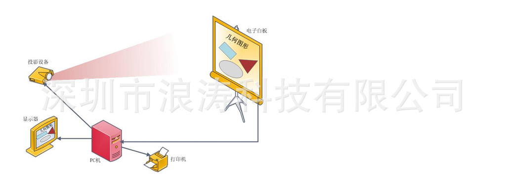 浪涛电子白板是一种基于PC机的、具有很强的人机交互功能的输入设备,通过与PC机连接,它既能显示计算机屏幕图像,同时又能通过电子笔操控计算机,完全突破了传统投影设备的单向操作,具有极强的交互性。一套完整的电子白板系统应该由以下几部分构成:电子感应白板、笔、PC机、投影设备以及相应的应用软件。