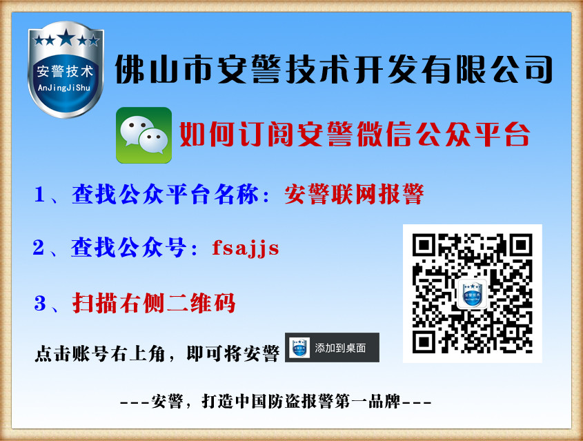 佛山安警技术开发有限公司微信公众平台已通过微信认证,欢迎新老客户关注我们,随时随地了解到安警最新动态。