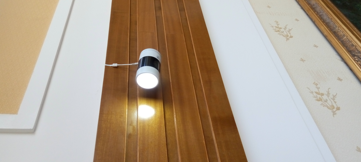 把隐形电线的背面的不干胶揭开,顺着墙角一路到了洗手间有电源插座的地方,插上适配器,通电,微家宝的灯不亮。惊了一下,原来是隐形电线的一个接头没插。12V的低压,电流才0.3A,安全是没事的。看看时间,刚好10分钟。