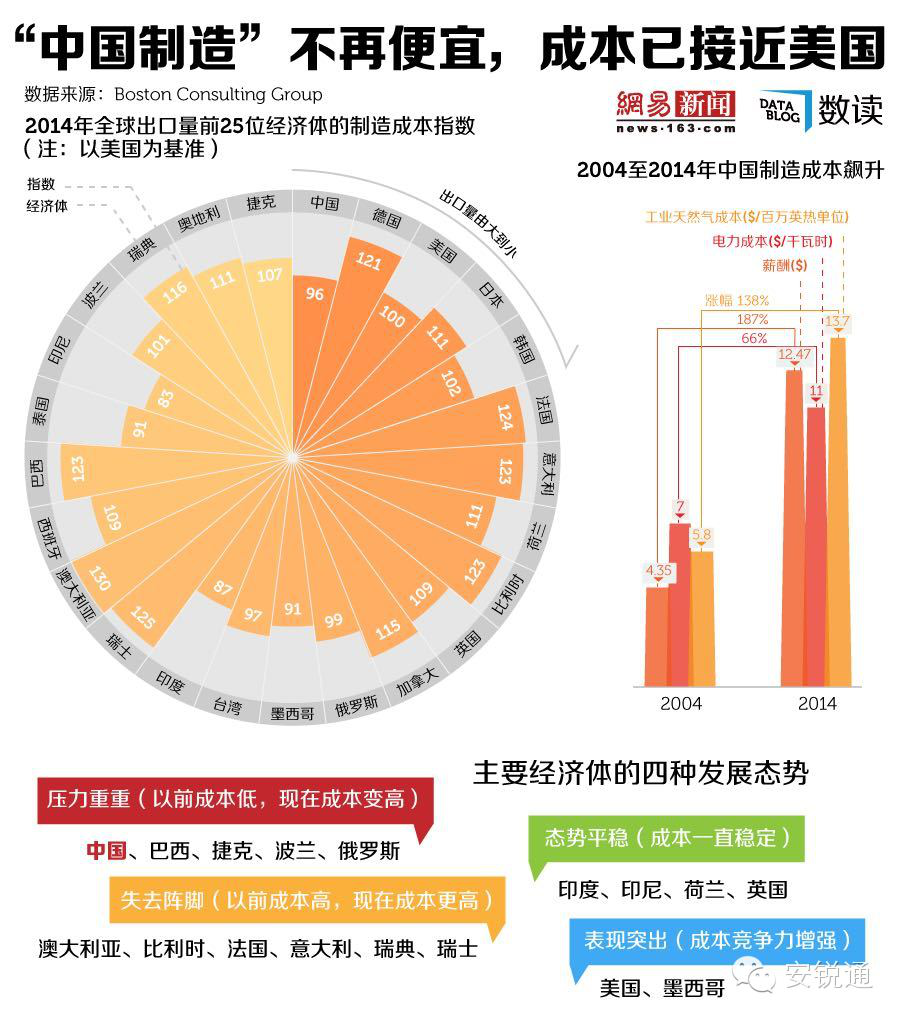 比如说制造业成本与美国差距不到5%,现在美国的品牌是什么?美国的产品是什么质量,但是我们现在的成本和美国差不多,只比他们低几个百分点,这是非常值得关注的。