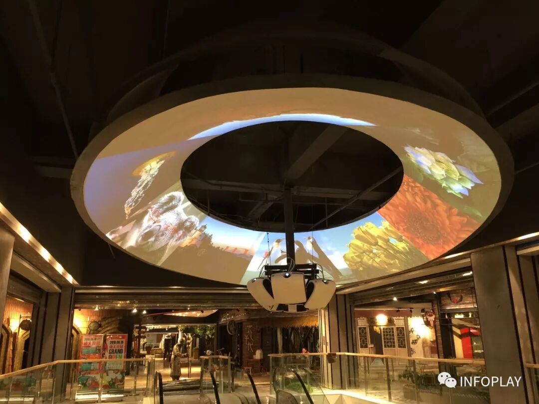 应用异型顶部融合图像形式来渲染商场的环境,INFOPLAY融合图像处理播放技术一如既往的不负纵望,在工期时间短,效果要求高的情况下达到了用户方与合作商的技术认可