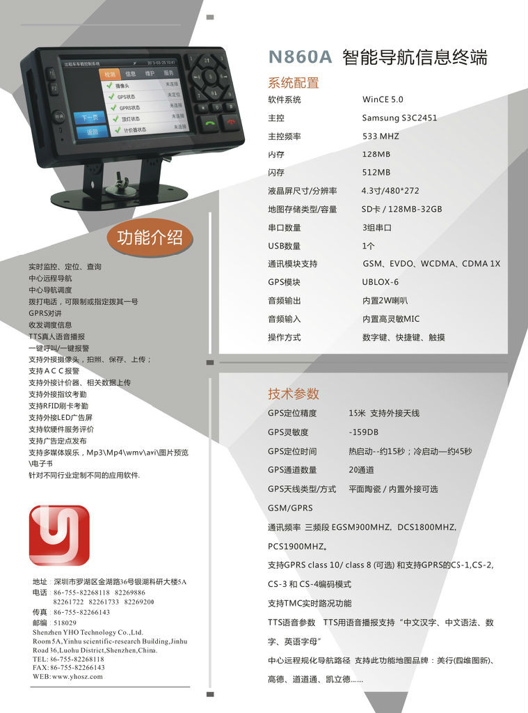 N860A产品,多项成功案例 1、软件系统 WinCE 5.0 ,主控频率 533 M Hz 2、4.3寸/480*272,内存 64M Bit/1G 3、TMC 实时交通 4、TTS真人语音 5、GPRS对讲,GPS通道数量20通道 6、GPS定位时间 热启动--约15秒;冷启动—约45秒 7、里程统计、超速报警、轨迹回放 8、电子围栏,手机查车 9、断油断电防盗功能