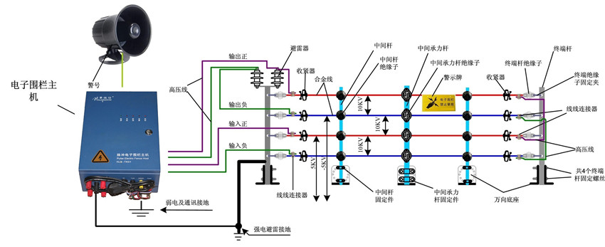 电子围栏分两个部分组成,电子围栏系统主机部分和电子围栏周界部分.电子围栏系统主机部分采用电子围栏主机,液晶键盘,警号,避雷器,室外防水箱,电池.电子围栏周界部分采用终端杆,承力杆,绝缘子,固定件,万向底坐,高压线,合金线,线线连接器,中间收紧器,围栏警示牌,电源线,信号线.