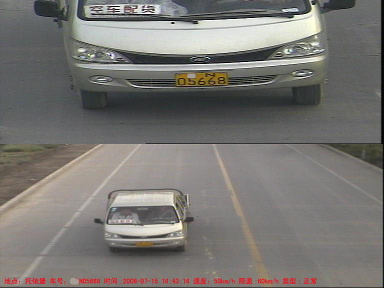 系统对通过检测线圈的每个车辆进行图像抓拍,包括特征图像(车头特写)及车辆全景图像两张彩色图片,每个图片的分辨率为768*288,24bit真彩色。在抓拍图像中,系统能够将检测到的车辆基本信息,如日期、时间、地点、方向、牌照号、车速、车辆类型(嫌疑、超速、正常)等叠加在全景图像上,便于人工判别及事后取证。