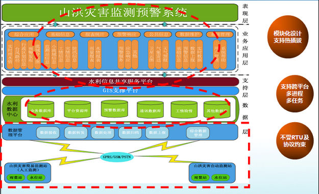 山洪预警系统是针对暴雨频发,地质地貌复杂,易发生山洪、泥石流、滑坡等地质灾害的地区着力打造的专业系统。系统以RTU实时遥测数据为基础,以山洪灾害监测、预警和响应为核心,集雨水情、气象监测、预警与应急响应等系统于一体,引入GIS技术、计算机网络技术、现代通信技术为一体,将水利专题数据与地形地貌数据有机整合,实现了基于真实场景下的汛情监视预警,同时包括群测群防组织及宣传培训体系,通过对各类数据的采集、传输、整合、查询、分析,达到稳定监测、及时预警、快速响应的效果,从而最大限度地减少人员伤亡和财产损失。