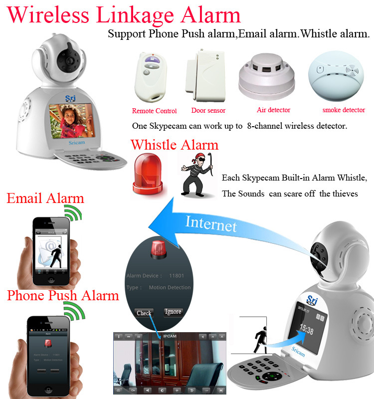●报警: 支持移动侦测报警,联动报警(可外接8路无线传感器),邮件报警,警笛报警,手机推送(报警时手机来电提示)。