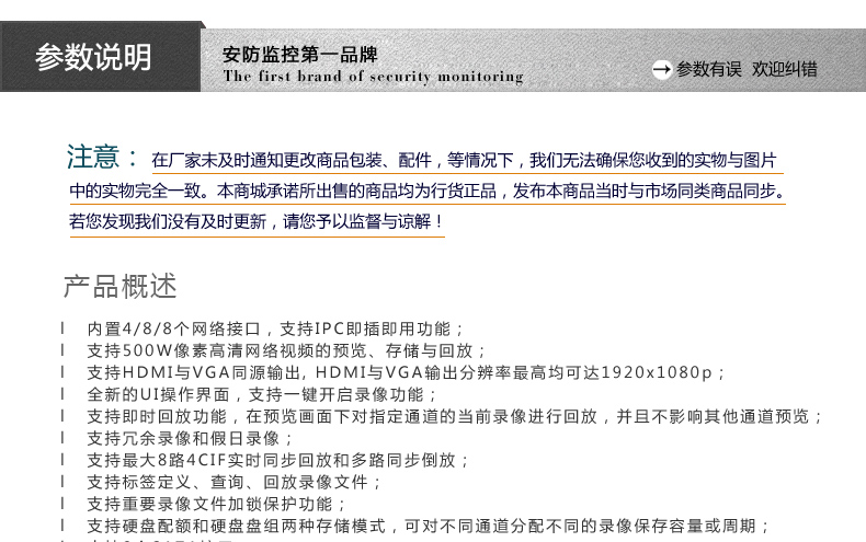 安防监控设备有:松下闭路电视监控系统产品、SONY闭路电视监控系统产品、Computar监控全系列镜头及百万像素级镜头、韩国CNB闭路监控系列产品、三星电子闭路电视监控系统产品国际品牌的经销;海康威视闭路电视监控系统产品、汉邦高科闭路电视监控系统产品、大华闭路电视监控系统产品、亚安闭路电视监控系统产品国内知名品牌的销售;艾礼富、BOSCH全线防盗报警系列产品;网络摄像机产品经销海康威视、天视达等品牌;并为客户订制各种控制柜、电视柜、室内外防护罩、支架等周边产品。