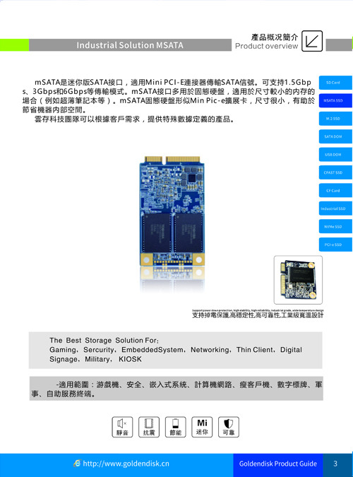 1、Goldendisk mSATA系列固态硬盘采用了高可靠性技术和设计