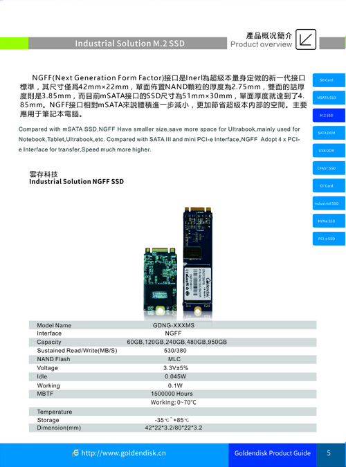 相比mSATA,传输速度更快 采用PCI-Express x2传输标准的NGFF接口SSD最大连续速度达到了700MB/s,写入也高达550MB/s,4K 随机读写IOPS分别达到了100K及90K。而使用PCI-Express x4传输标准的NGFF接口SSD最大持续速度更是达到了2260MB/s和1600MB/s。