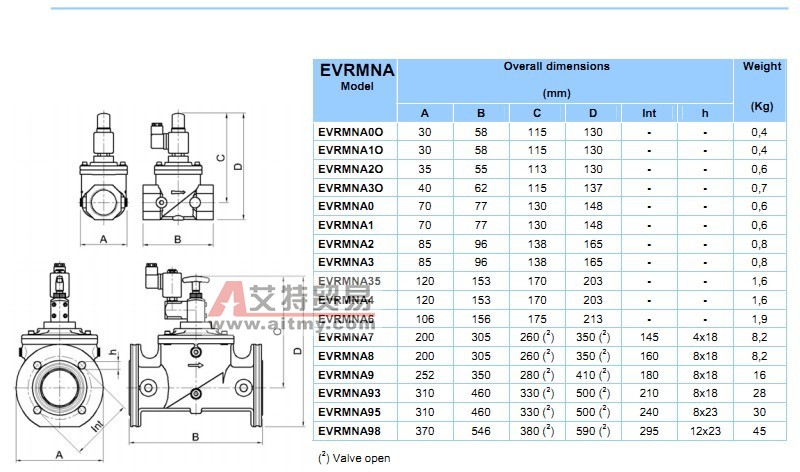 EVRM-NA3防爆切断阀 型 号 口径 压力(mbar) 功率(w) A(mm) 深度Depth 法兰孔间距Int 法兰孔及孔径 重量(kg) EVRM-NA3 Rp1" 500 16 96 85 - - 0.8