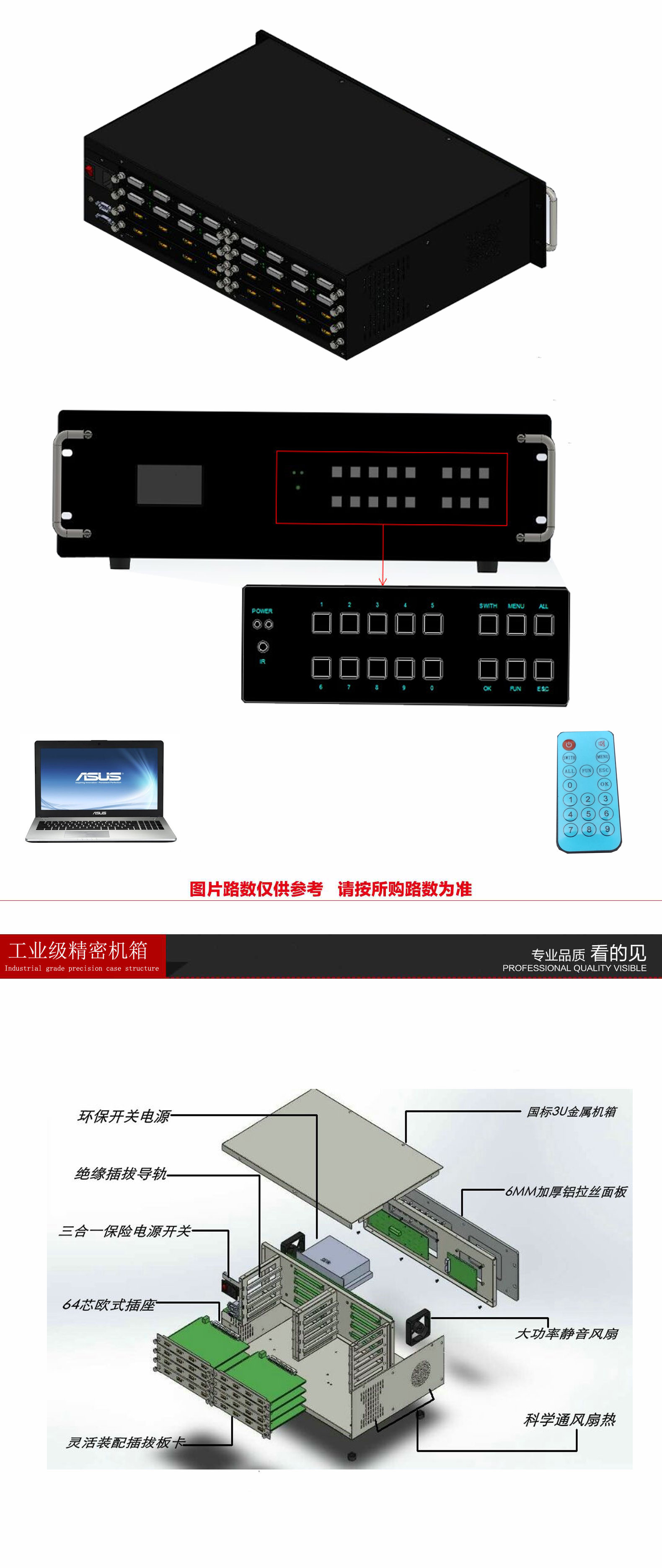 4.采用国际标准机架式金属机箱,高档全铝拉丝前面板。配有方便操作的控制面板按键以及高档蓝光液晶显示屏,同时可以通过配套的红外遥控和电脑控制软件进行多方位任意切换。