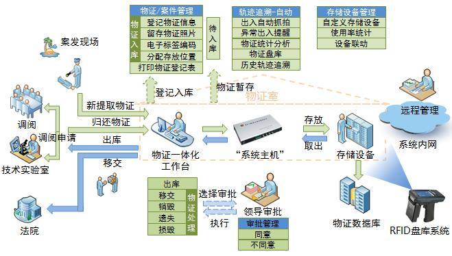 公安局物证管理系统硬件主要由管理主机、电子标签、采集终端存储设备及相关辅助设备组成。软件系统由凌泰科技公安物证管理系统和公安系统内部其他系统对接组成。