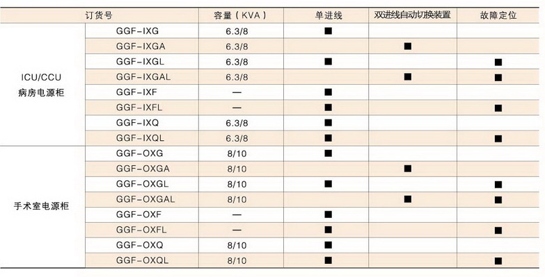 医用隔离电源柜是针对医疗2类场所的供电需求而设计的具有局部IT系统的配电柜,IT系统装设绝缘监测装置来监测系统的绝缘状况,各输出回路采用了具有短路保护功能的断路器;TN-S系统输出回路则采用了具有漏电保护功能的断路器。产品根据使用场所的不同分为GGF-O系列手术室用隔离电源柜、GGF-I系列ICU/CCU等病房用隔离电源柜,以及隔离变压器外置,嵌入墙体安装,用于手术室配电的GRF-O和用于ICU/CCU等病房的GRF-I隔离电源柜四类,这些产品能够很好的满足各类手术室和重症监护室对电源安全性和可靠性的要求,并符合GB16895.24-2005/IEC60364-7-710:2002《建筑物电气装置第7-710部分:特殊装置或场所的要求—医疗场所》和GB7251.1-2005/IEC 60439-1:1999《低压成套开关设备和控制设备》等标准。