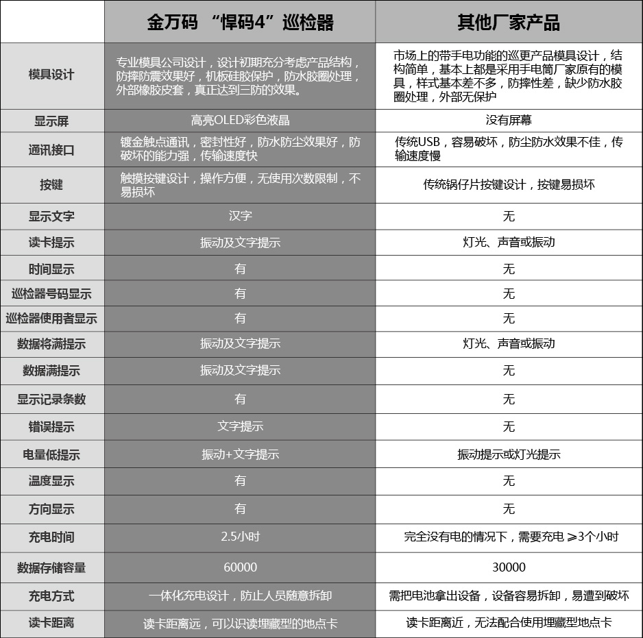 采用汉字加振动提示“读卡成功”及巡检器的各种工作状态提示。采用新型防破坏防水USB通讯方式(速度快,抗电磁干扰,误码率低);采用聚合物锂离子充电电池,无需反复拆卸更换电池。