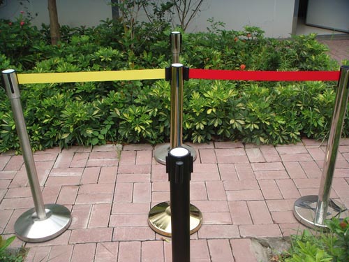 栏杆座组成部分包括带十字拉头的栏杆座或圆头栏杆座,伸缩栏杆带或带锁栏杆绳4个主要构成。通过颜色鲜明的伸缩带和带锁栏杆绳连通两个或若干个栏杆座头可以形成一定区域,有时用作排队时维持秩序。有时又可以围成一个封闭的区域,起到隔离防护作用。很多时候与指示牌一起运用,起到醒目、提示作用。