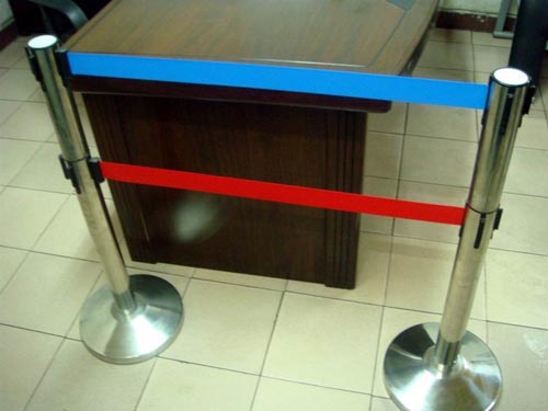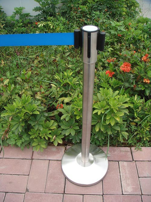 栏杆座组成部分包括带十字拉头的栏杆座或圆头栏杆座,伸缩栏杆带或带锁栏杆绳4个主要构成。通过颜色鲜明的伸缩带和带锁栏杆绳连通两个或若干个栏杆座头可以形成一定区域,有时用作排队时维持秩序。有时又可以围成一个封闭的区域,起到隔离防护作用。很多时候与指示牌一起运用,起到醒目、提示作用。