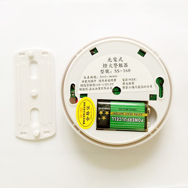 -按下並保持住測試按鈕至少3秒鐘,一個清脆響亮的脈動報警信號就會發出,這意味著探測器真正工作,在報警的同時,發光二極體快速閃爍。也可以用煙霧吹進探測腔中的方法來測試探測器。(每星期做一次測試以得證探測器的可靠工作。)