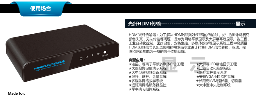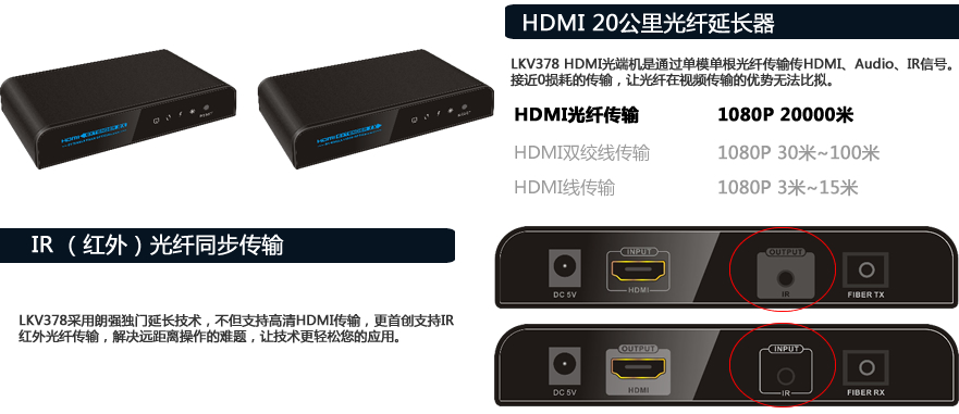 LKV378 HDMI光纤传输器:为了解决HDMI信号较长距离的传输时,发生的图像马赛克,颜色失真,无法传输等问题,是专为网络平板显示及大屏幕幕墙显示广告工程、工业自动化控制、医疗设备、安防监控、多媒体教学等显示系统工程中高质量HDMI视频信号长距离传输的需求而专业设计的集HDMI信号转换、驱动、接收和还原功能为一身的信号传输系统。
