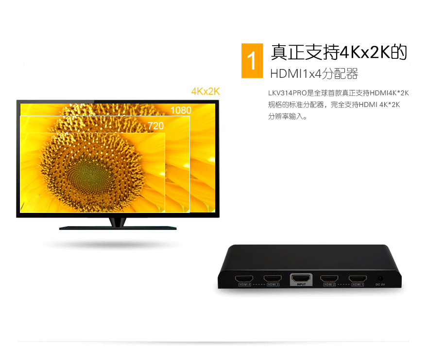 朗强LKV314RPO hdmi分配器一进四出,HDMI1.4分配器是朗强最新研发并生产的数字高清分配器,可以将一路的HDMI信号分配成四路同步的HDMI信号输出,对输出的同步信号采用放大能力,同步输出的HDMI信号实现最长30米的远距离HDMI传输(4K*2K分辨率建议使用5米以下HDMI1.4线)。更支持采用级联的方式显著提升HDMI输出端口数量。