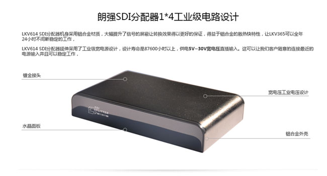 朗强lkv614 1x4 hd-sdi分配器,SDI分配器是一款将任何一路高清HD/3G-SDI串行数字视频信号采用广播级处理技术,高清晰、无失真、无延时的分配成4路同步信号到多个高清电视,投影设备,显示大屏上,内置自动设备芯片自动识别兼容SD-SDI、HD-SDI、3G-SDI全格式的SDI信号。让客户轻松操作广播级的SDI分配器。更采用工控级电源设计支持5V~36V自动识别,大大的延长使用寿命。