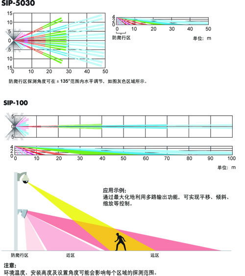 SIP-100创建一个100m的长距离探测区域,并共有3个输出:2个独立输出用于远区域和近区域,另外一个用于防爬行。多输出对启用视频传输系统及控制PTZ摄像机非常有用。SIP-5030和SIP-100主要区域的探测角度能够简易调节以适应摄像机的视野。并且,防爬探测区域能够用于装置正文或附近区域的探测。