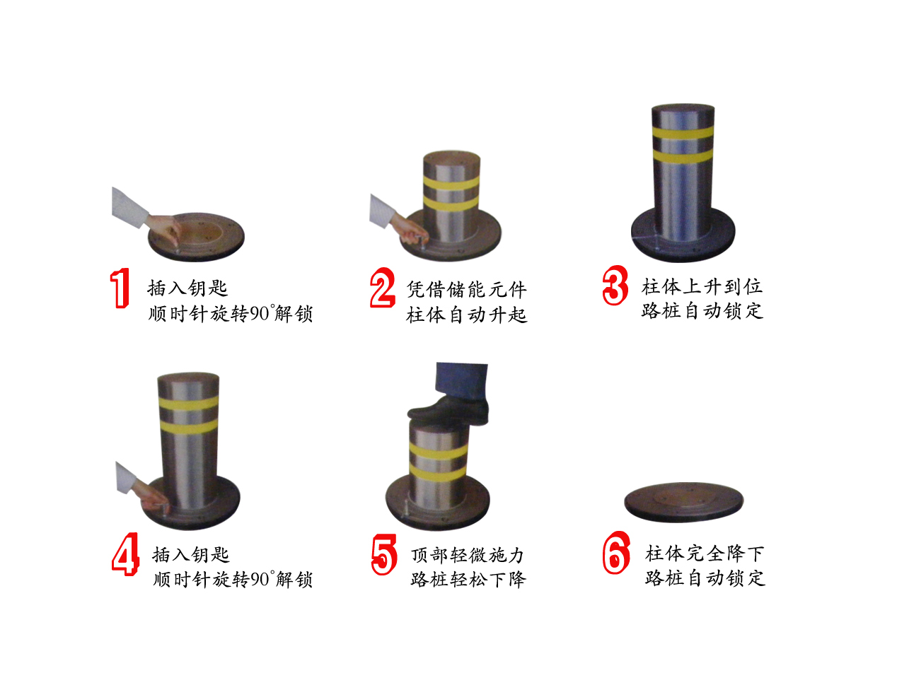 上 升:转动钥匙,路桩会升起,并在最高位置自动锁定。