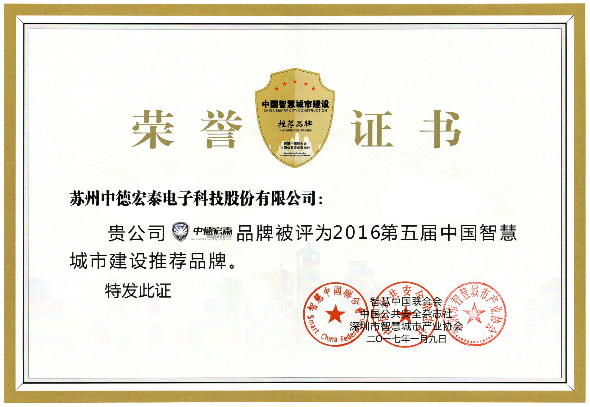 2017年1月9日,由中国公共安全杂志社、CPS中安网、深圳市智慧城市产业协会、智慧中国联合会、全国城市安防协会合作互助联盟主办的“2017全国安防界迎春团拜会”在深圳世界之窗凯撒宫隆重举行。