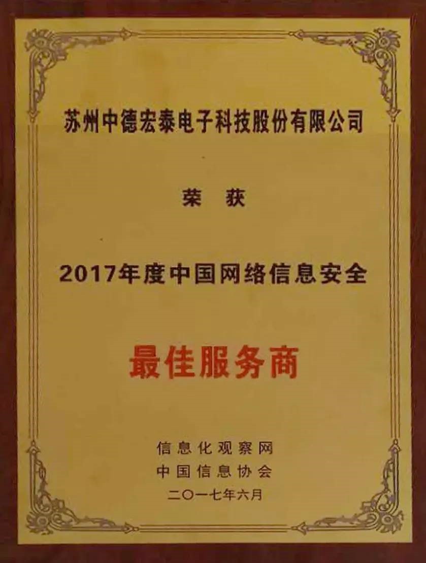 2017年6月9日,由中国信息协会主办,信息化观察网承办的“2017中国网络信息安全峰会”在北京隆重召开,中国工程院院士沈昌祥,国家信息中心副主任张学颖,公安部网络安全总工程师郭启全,中国信息协会会长何翠琴等领导出席本次会议,中国信息协会副秘书长傅伯岩主持会议。中德宏泰作为网络安全服务先进企业受邀出席本次峰会,荣获两项殊荣:“2017年eID网络身份识别领军企业奖”、“2017年中国网络信息安全最佳服务商奖”。