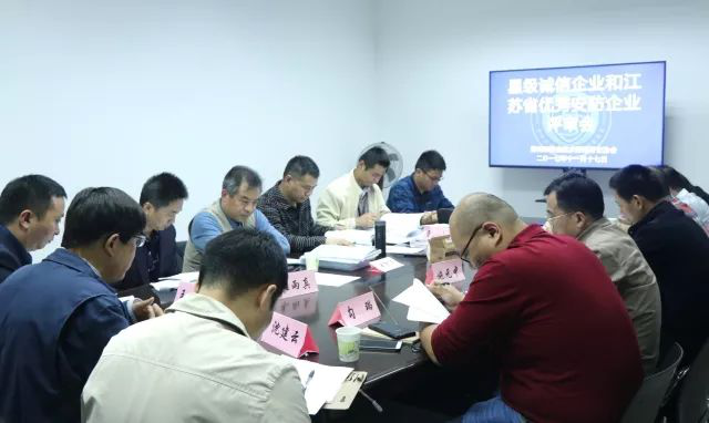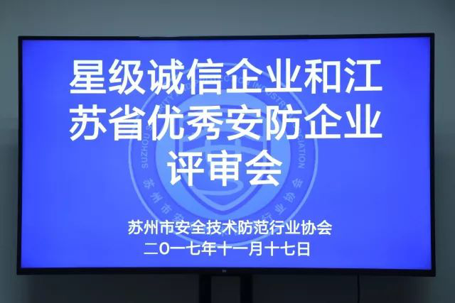 2017年11月17日下午,苏州市安防协会于协会办公室召开星级诚信企业和江苏省优秀安防企业评审会。参与本次评审会的评审团由诚信委主任委员理事长单位勾璐,诚信委副主任委员副理事长施元中、贾春海,诚信委轮值委员副理事长陈建、沈利泽,苏州网信工商信用服务有限公司总经理沈建云、江苏鑫思泰信用服务有限公司总经理王波,和苏州市安防技术专家、诚信委员共16人组成。