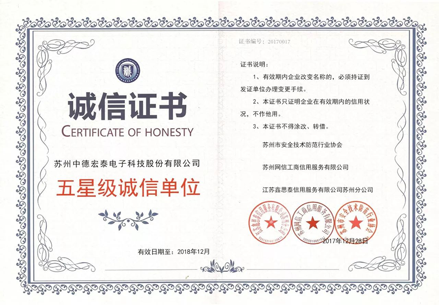 12月28日下午,2017年苏州安防协会年度会议召开。省市公安部门领导、中国安防协会领导以及苏州市安防协会各理事单位代表参加了会议。会上,由苏州市安全技术防范行业协会、苏州网信工商信用服务有限公司及江苏鑫思泰信用服务有限公司苏州分公司联合评选出23家的五星级诚信单位。中德宏泰非常荣幸获此殊荣,被评为“五星级诚信单位”。