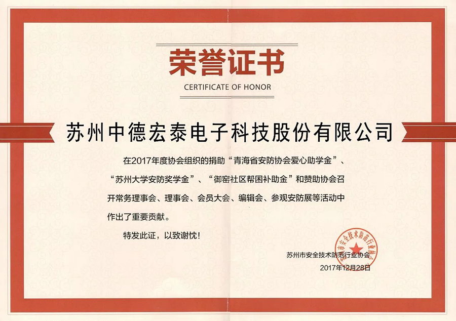 此外,中德宏泰在2017年度协会组织的捐款“青海省安防协会爱心助学金”、“苏州大学安防奖学金”、“御窑社区帮困补助金”和赞助协会召开常务理事会、理事会、会员大会、编辑会、参观安防展等活动中作出了重要贡献,此次会议中对捐助荣誉企业进行了表彰仪式。