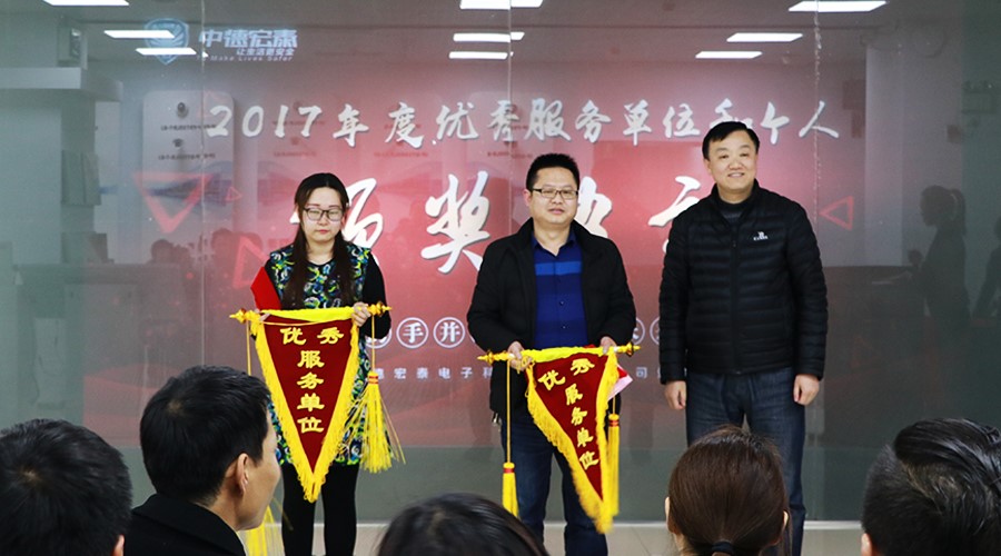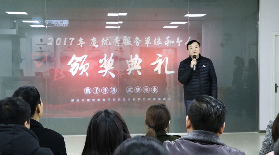 2018年2月8日,中德宏泰2017年度优秀服务单位、优秀服务标兵颁奖典礼在昆山总部隆重举行,常务副总徐立红、董事长秘书兼总经理特助武静、总经理执行助理兼市场总监赵朝阳出席仪式,徐总为本次颁奖典礼致辞。