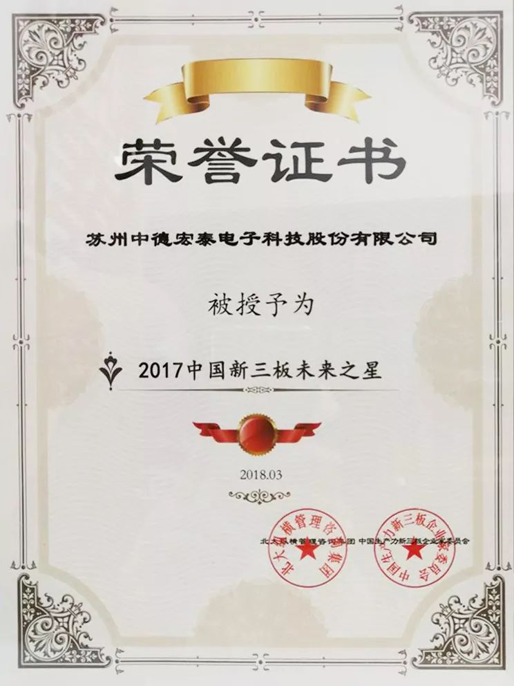 2018年3月3日,由国内著名新三板专业服务机构——北大纵横管理咨询集团,联合中国生产力新三板企业家委员会、新三板文学社、挖贝网、第一路演和新三板+,主题为“新时代、新格局、新模式”的“第三届中国新三板企业家论坛”在京隆重举办。中德宏泰(证券代码:833067)董事长秘书兼总经理特助武静女士受邀参加论坛,苏州中德宏泰电子科技股份有限公司凭借在新三板市场中的突出表现,被授予为“2017中国新三板未来之星奖”。