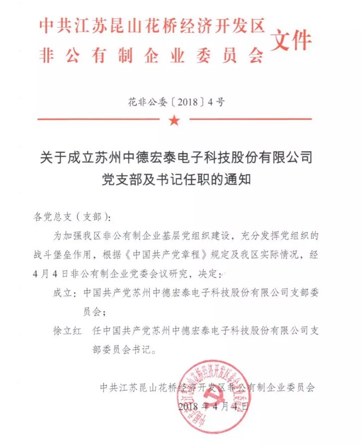 中德宏泰收到由中共江苏昆山花桥经济开发区非公有制企业委员会文件,关于我司成立党支部及书记任职的批复,我司常务副总经理徐立红任党支部书记。这是中德宏泰的一件喜事,也是公司发展史上的一件大事。我司将全力支持、全面配合党建工作,鼓励优秀员工加入党的队伍,将党风建设推向新的高度。