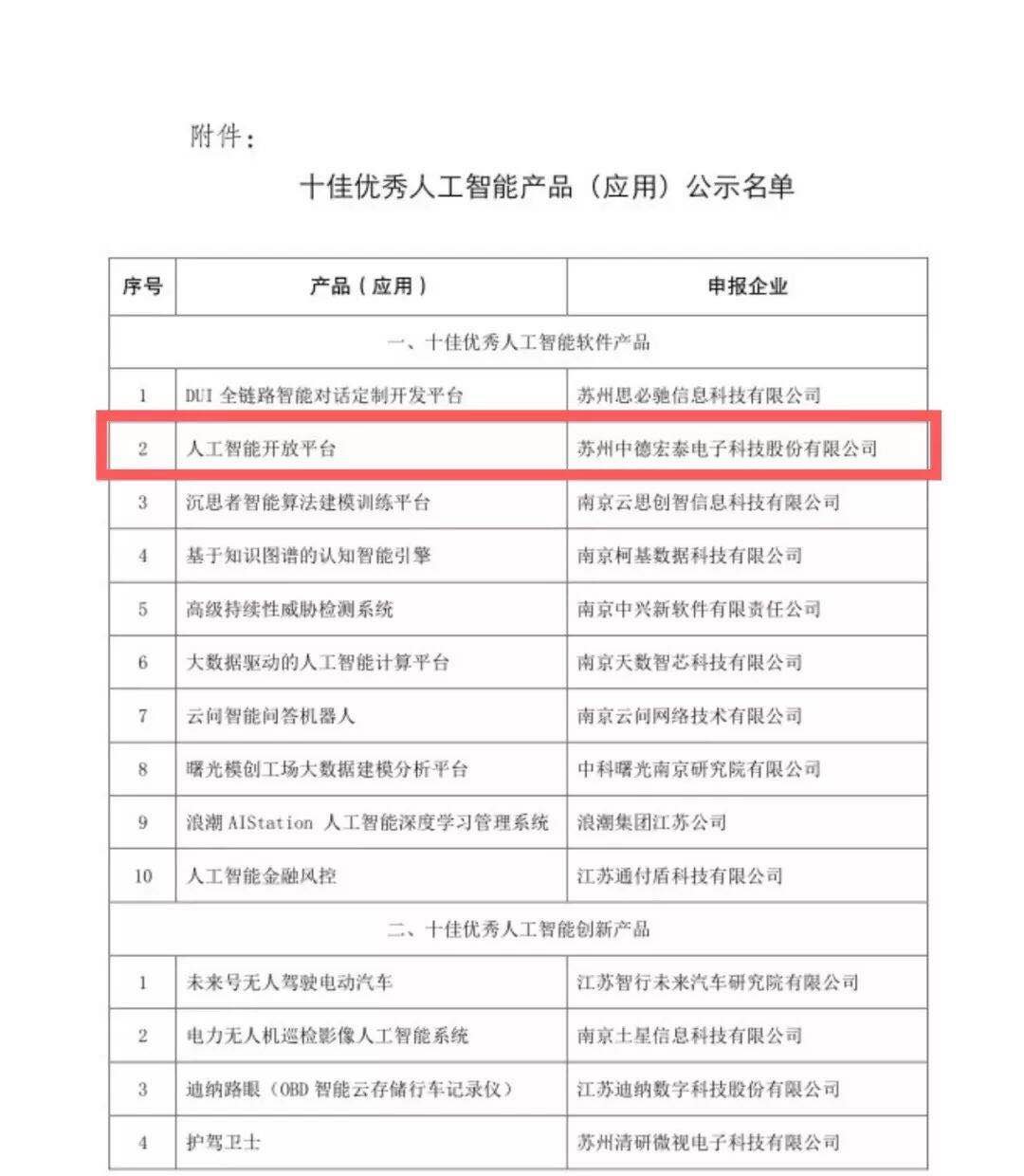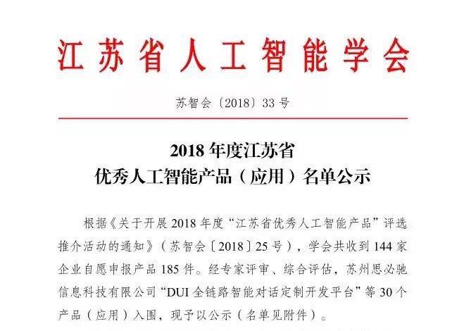 根据《关于开展 2018 年度“江苏省优秀人工智能产品”评选推介活动的通知》(苏智会〔2018〕25 号),学会共收到 144 家企业自愿申报产品 185 件。经专家评审、综合评估,苏州思必驰信息科技有限公司“DUI 全链路智能对话定制开发平台”等 30 个产品(应用)入围,中德宏泰被评选为2018 年度江苏省优秀人工智能产品(应用)现予以公示(名单见附件)。