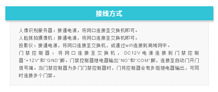 本篇文章小泰来为大家介绍VDIN智能门禁系统的安装方法。系统由以下几个部分组成:人像识别服务器、人脸抓拍摄像机、投影仪、门禁控制器、投影膜、网络交换机。