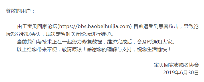 6月30日,宝贝回家志愿者协会在其官网上声称论坛遭遇攻击,导致数据丢失,决定暂时关闭论坛,努力恢复数据。