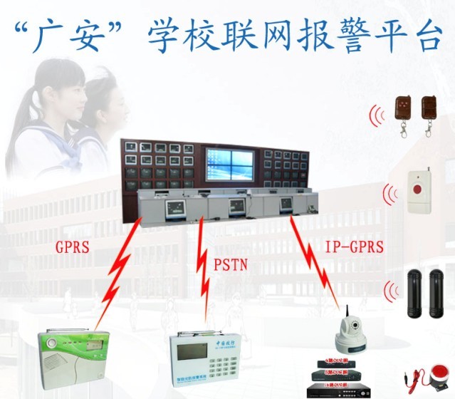 为了有效的解决校园安全问题,加强学校学生进出口及重要部位(如:微机室、实验室、图书馆、档案室、电教室、车库等)的安全,我们专门为学校设计了一套适用于学校安全的联网报警系统,该系统有效的解决了学校重要部位的报警需求,有效的避免巡逻盲区,提高学校安全保卫及综合管理能力。将广安报警主机及平台客户端安装在学校的监控室,并与安装在学校各个出入口、走廊等部位的视频摄像头相连接。红外探测器安装在微机室、实验室、财务室、图书馆、档案室、电教室、车库等部位,一旦有人闯入学校实施暴力犯罪活动或非法入侵要害部位时,学校保安员可以触发安装在门卫室的紧急报警按钮或随身携带的摇控报警器。无人的防区遇有非法入侵时,红外探测器将自动报警。触发报警后,学校保卫室的警号立即响起,报警设备自动将现场情况(包括现场视频)传送到公安局110指挥部,视警报警情况指调110民警迅速赶到现场进行处置。