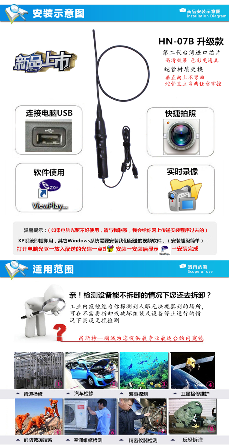 经客户反馈,老款蛇管太软,不够高清,您们的意见我们非常重视,将不断努力对产品进行改善,于2013年10月底,升级款手柄内窥镜终于完善改制,谢谢您的一路支持伴我们成长,我们会用更好的服务和产品来报答您。